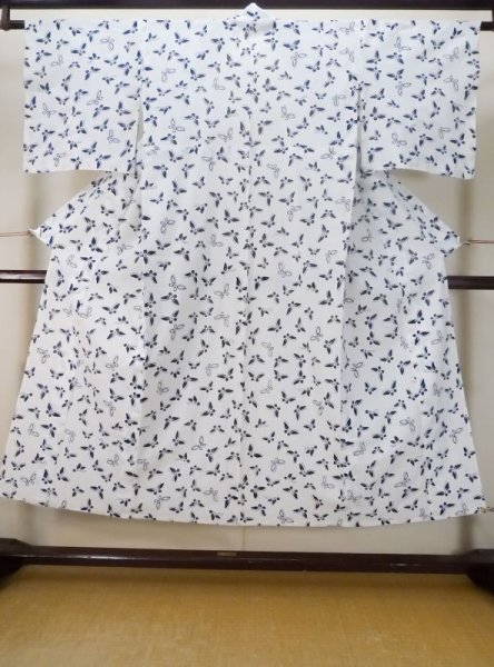 M0620I 浴衣(日本製) 女性用着物 綿麻 白, 蝶々 【中古】 【USED】 【リサイクル】 ★★☆☆☆