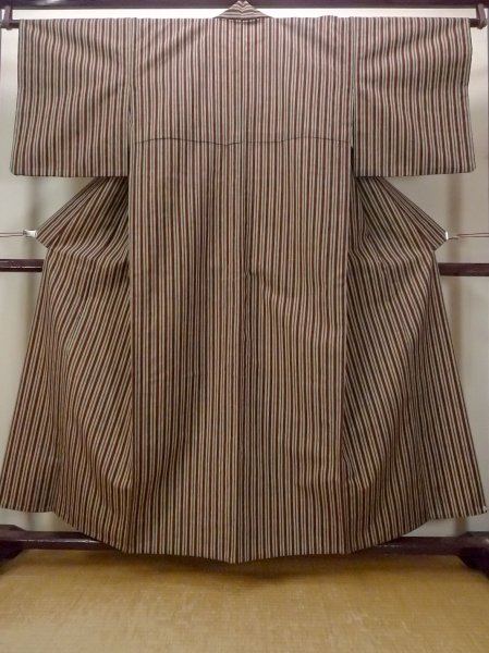 N0814A 女性用 紬 ウール 灰色がかった ベージュ, 縞 【中古】 【USED】 【リサイクル】 ★★★☆☆