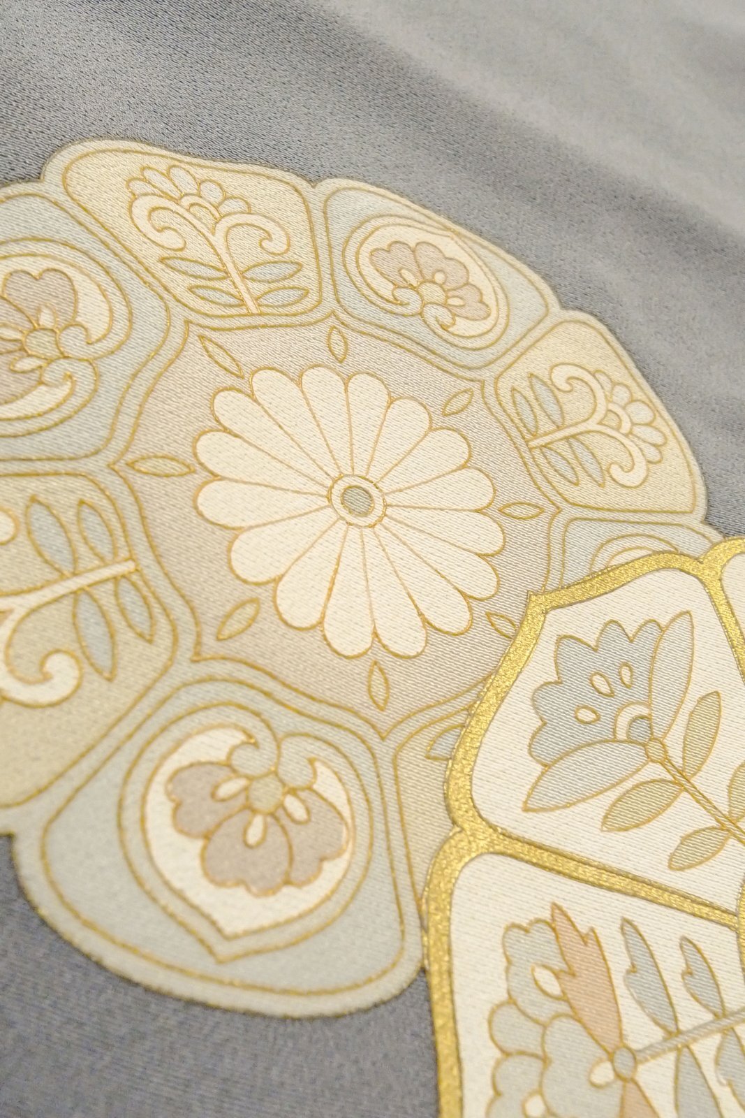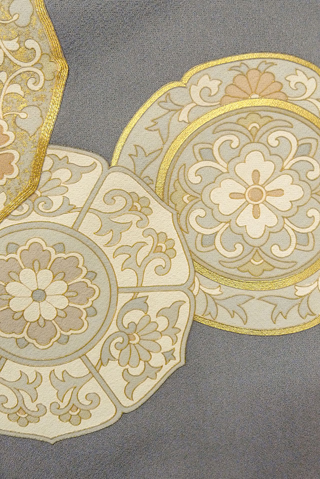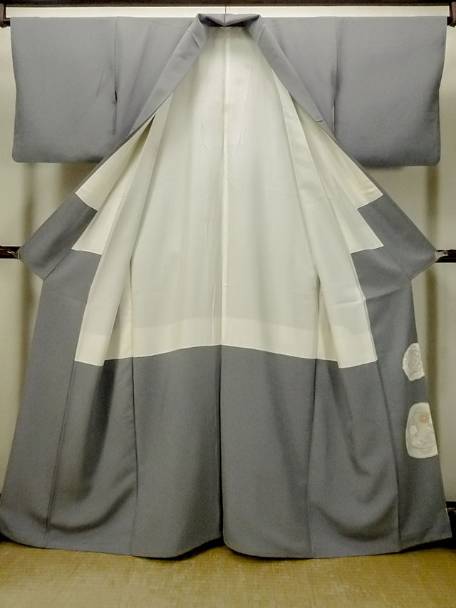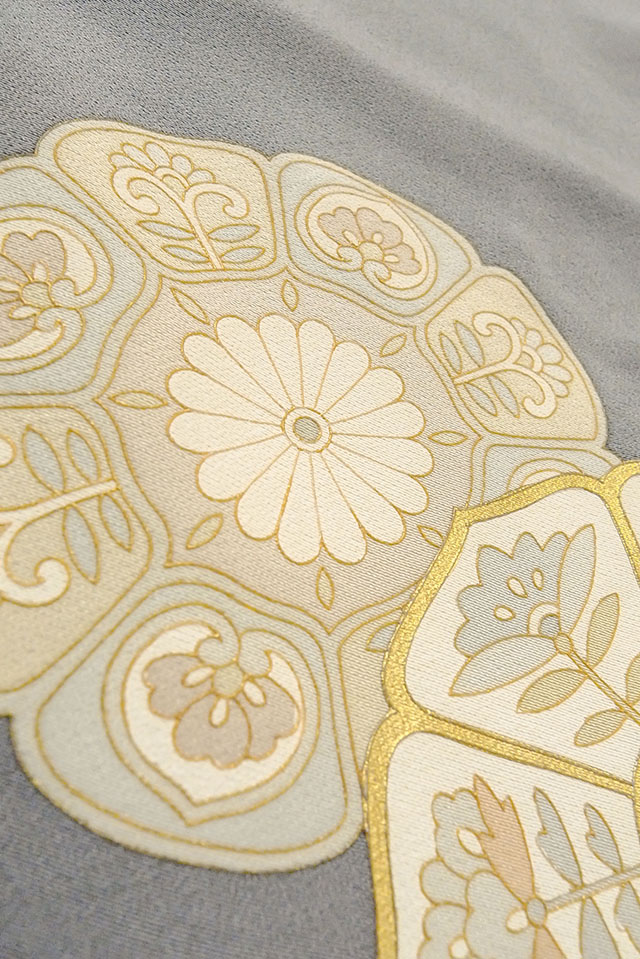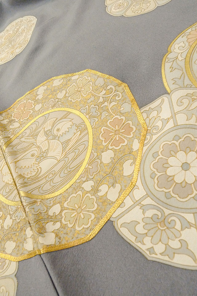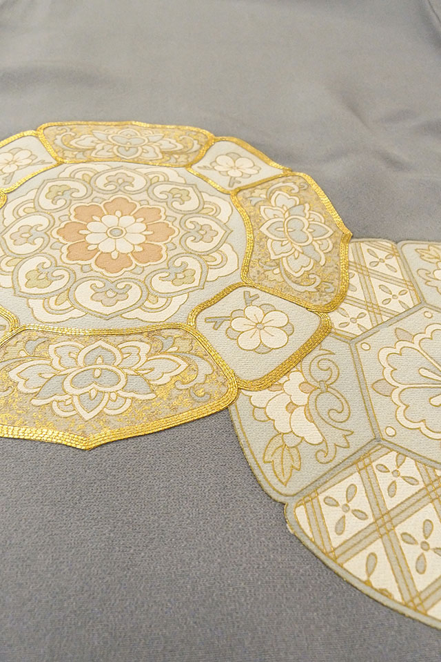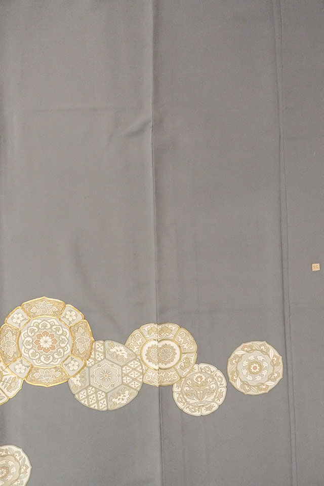 O0624J"女性用留袖 シルク(正絹) 青み灰色, 唐花 【中古】【USED】【リサイクル】 ★★★☆☆【O0624J】