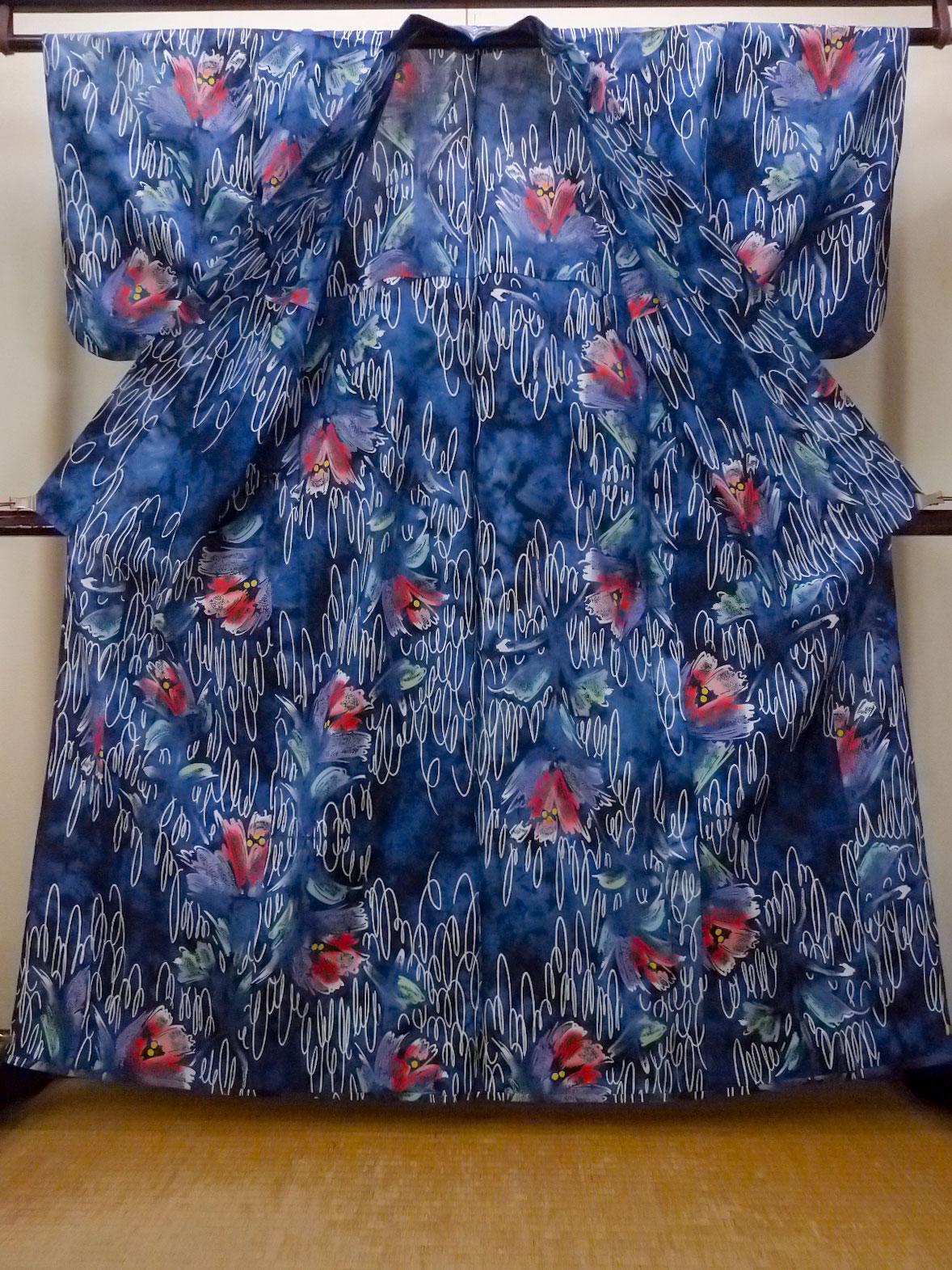 O0718T"女性用注染浴衣 綿 藍, 花 【中古】【USED】【リサイクル】 ★★★☆☆【O0718T】