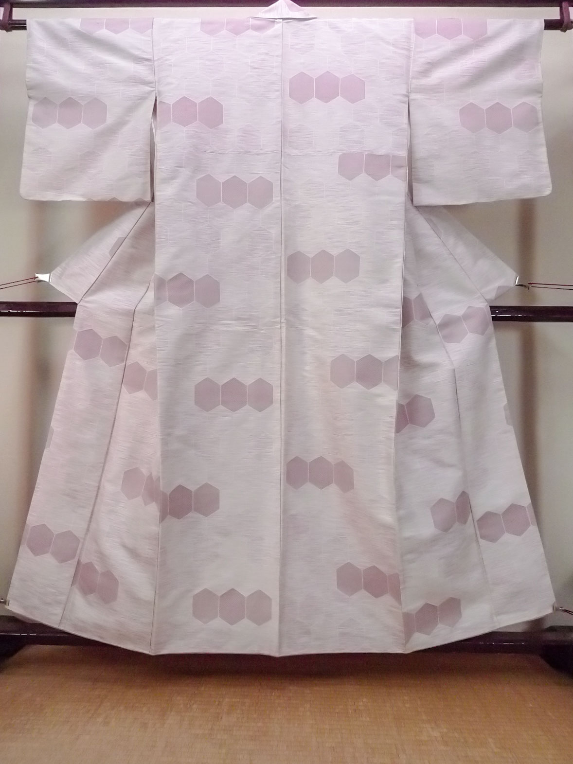 N1015D 女性用紬 シルク(正絹) 淡い赤み藤色, 松皮菱 【中古】【USED】【リサイクル】 ★★☆☆☆【N1015D】 [N1015D]