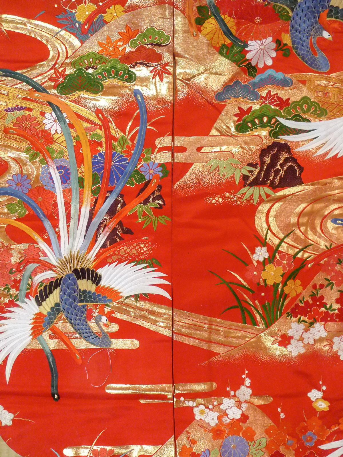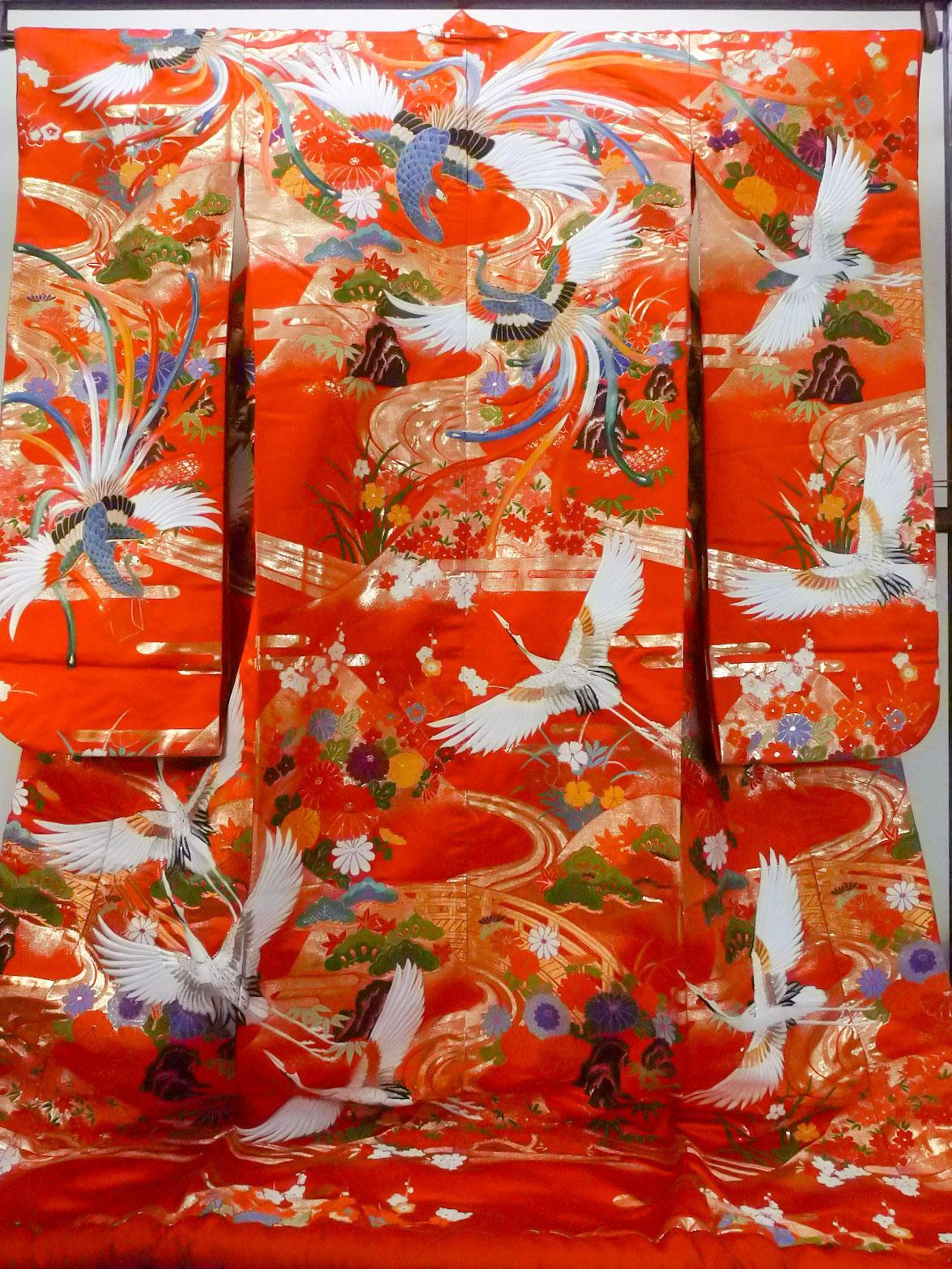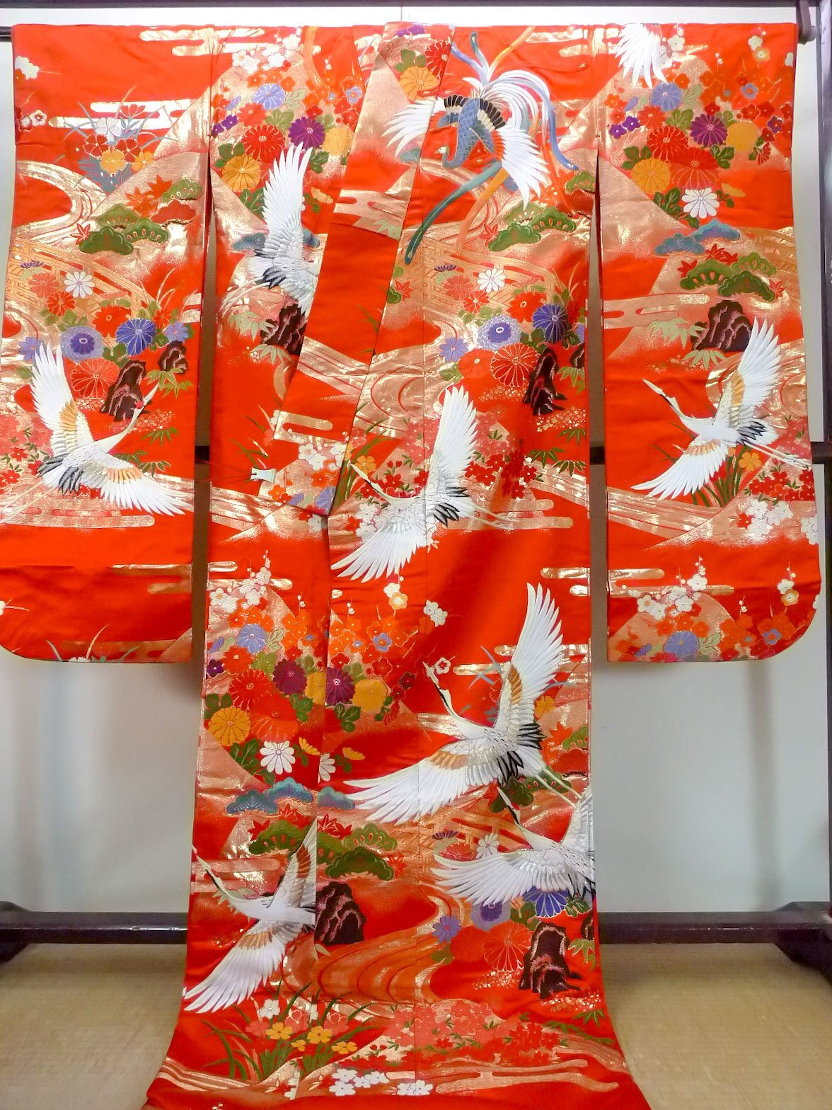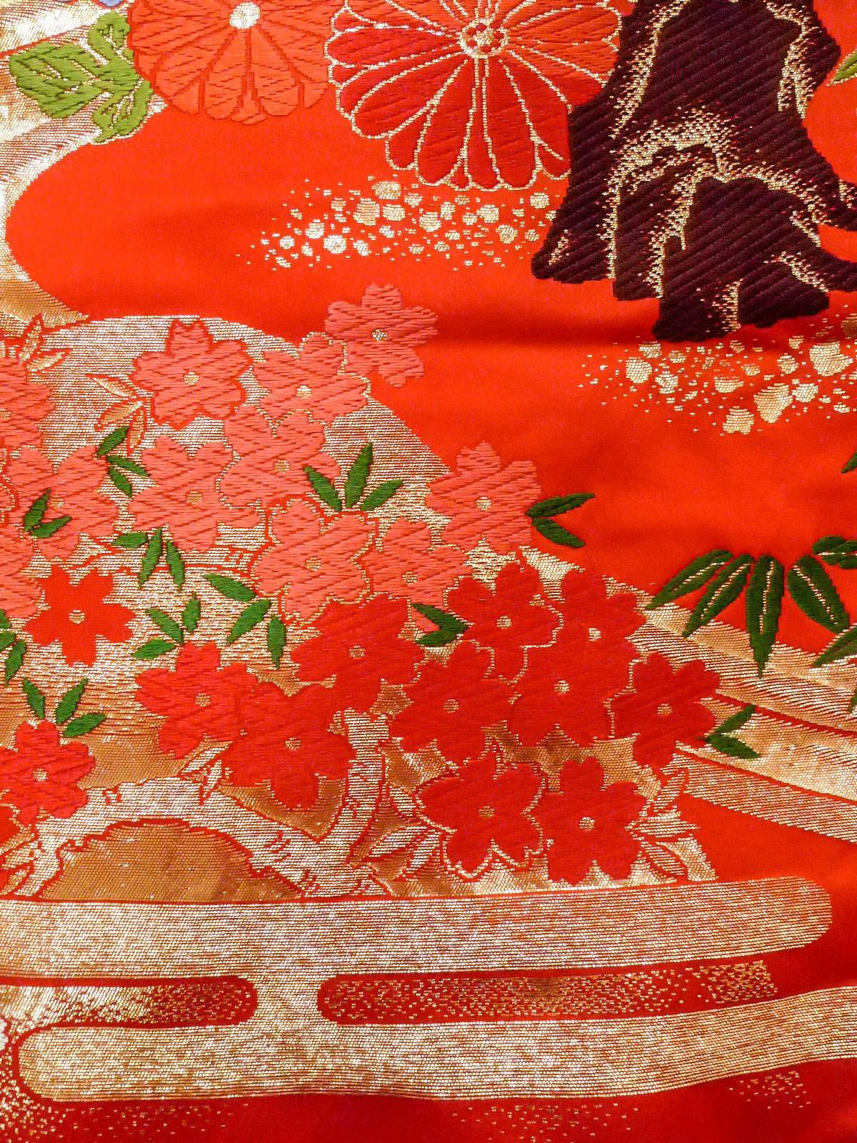 N1015R 女性用打掛 シルク(正絹) 光沢のある赤色, 桜 【中古】【USED】【リサイクル】 ★★★☆☆【N1015R】 [N1015R]