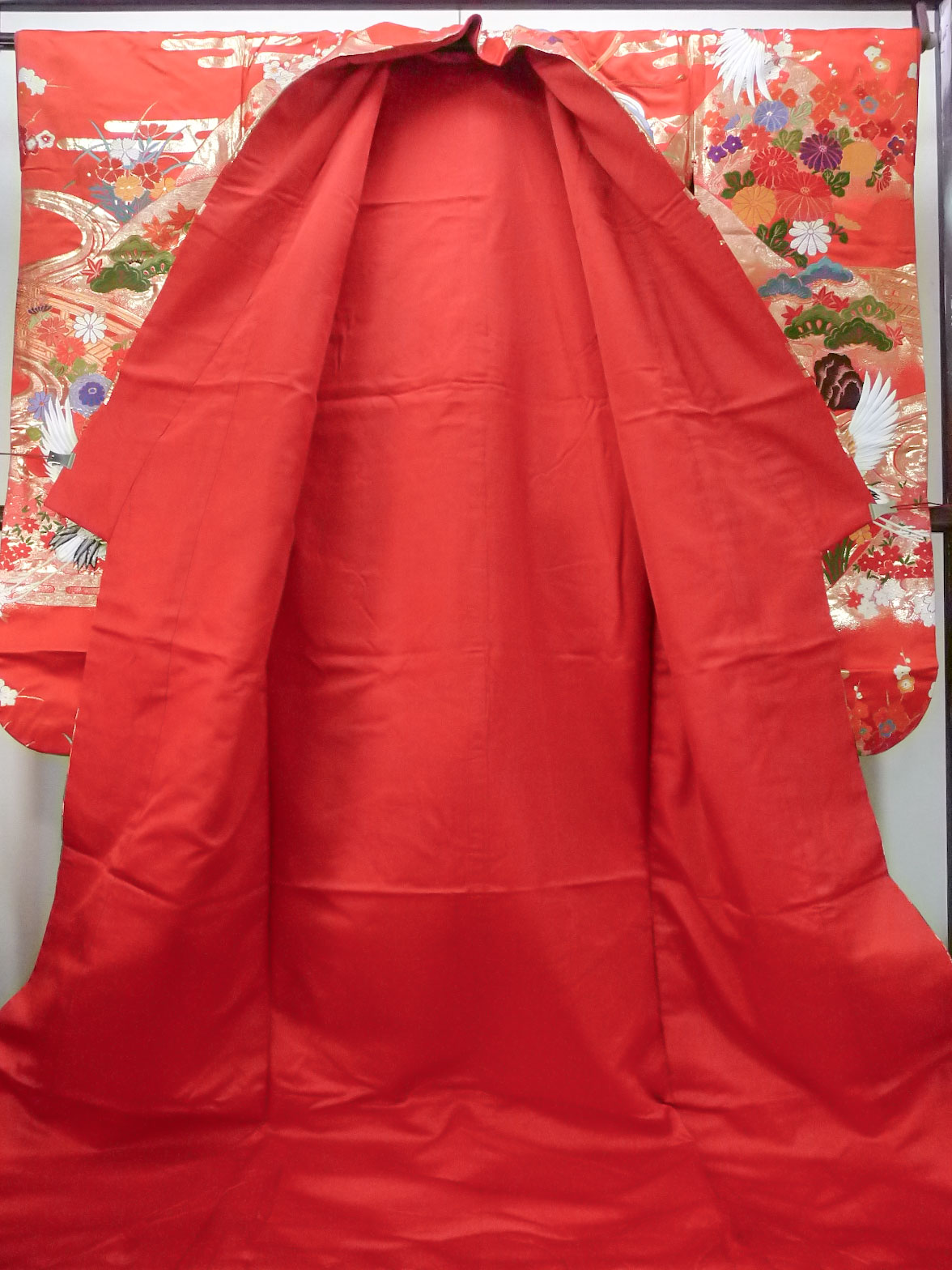 N1015R"女性用打掛 シルク(正絹) 光沢のある赤色, 桜 【中古】【USED】【リサイクル】 ★★★☆☆【N1015R】