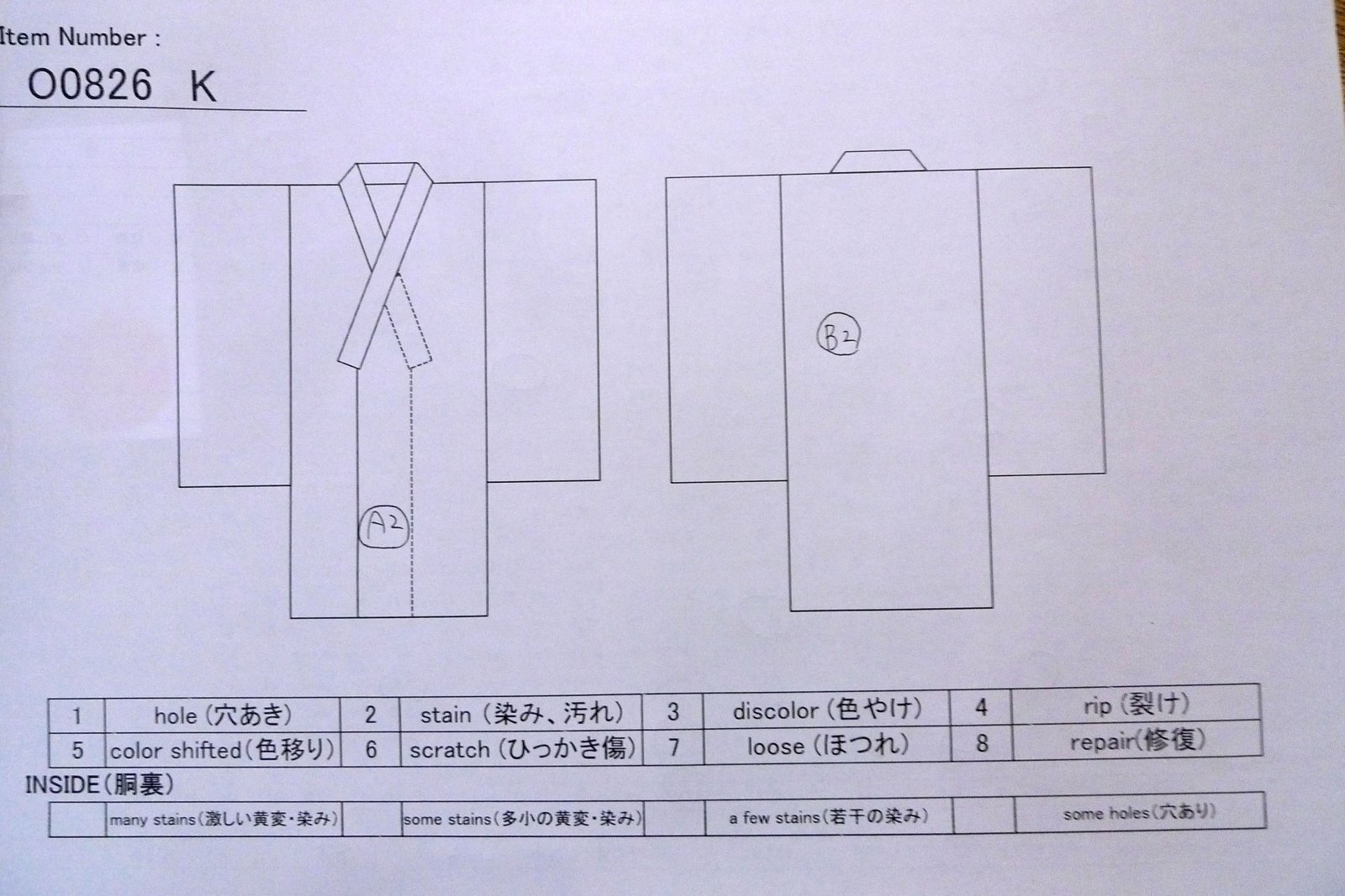 ![]() | 袖から袖 : | 54.3" | 138cm (裄:69cm / 1 尺 8 寸 2 分) | |