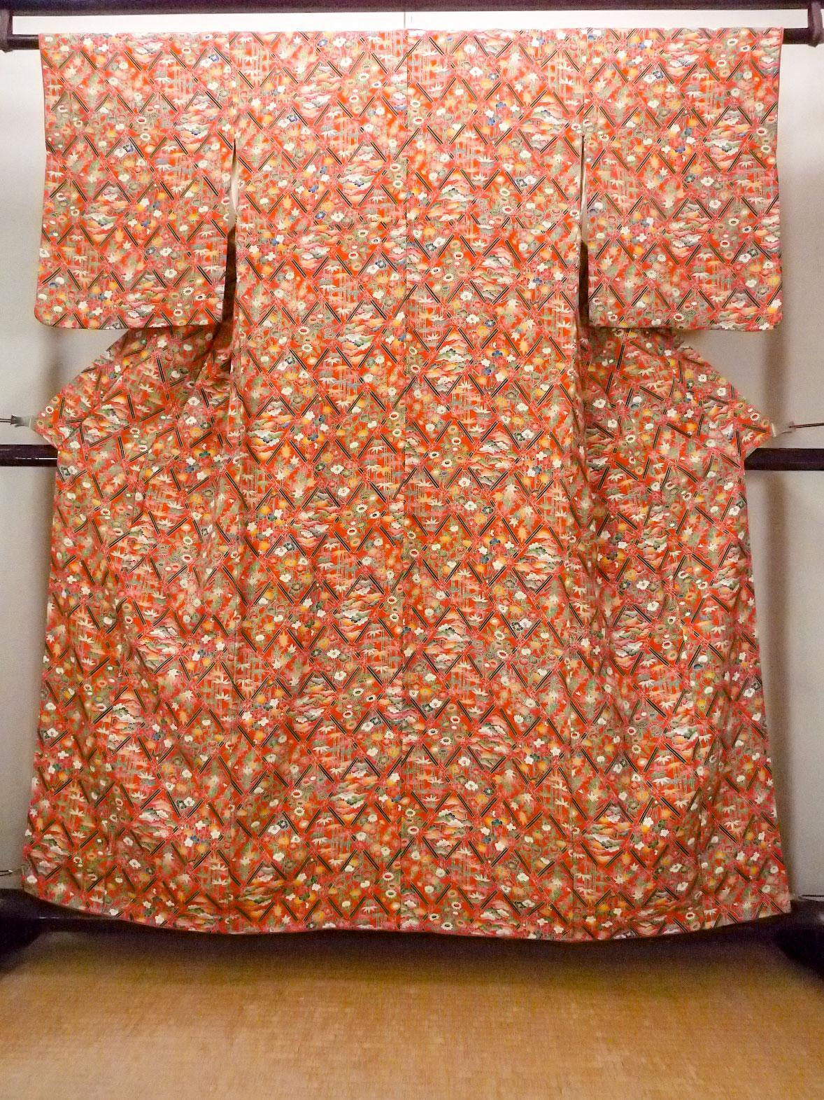 O0826V 女性用小紋 シルク(正絹) 鮮やか橙色, ぼたん 【中古】【USED】【リサイクル】 ★★★★☆【O0826V】