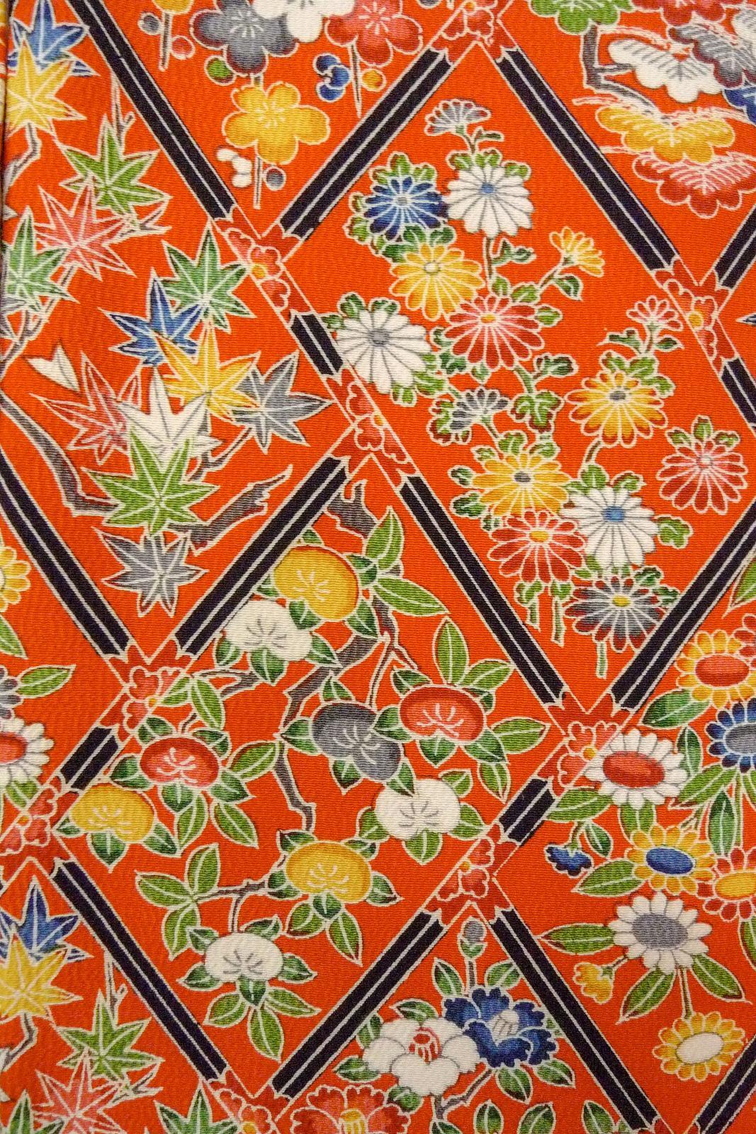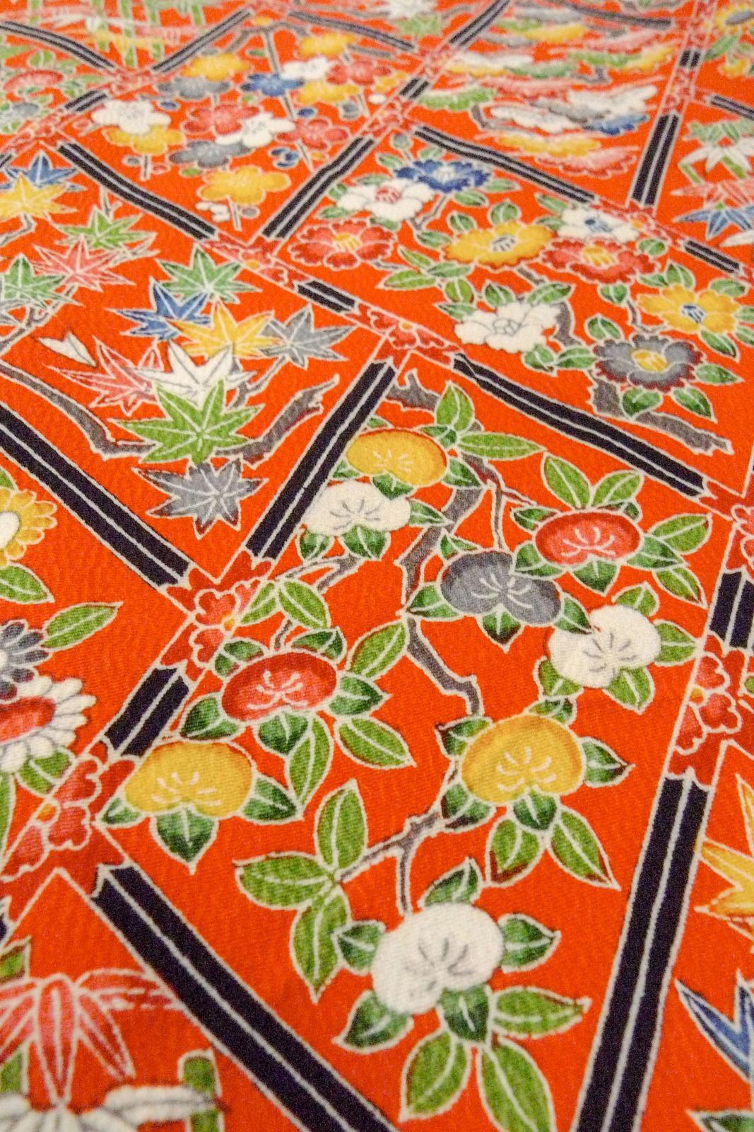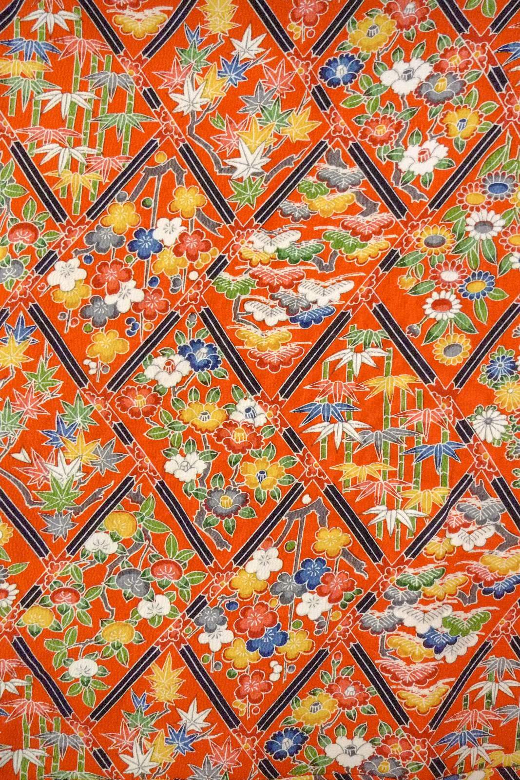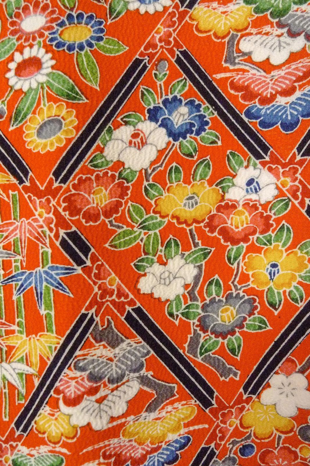 O0826V 女性用小紋 シルク(正絹) 鮮やか橙色, ぼたん 【中古】【USED】【リサイクル】 ★★★★☆【O0826V】 [O0826V]