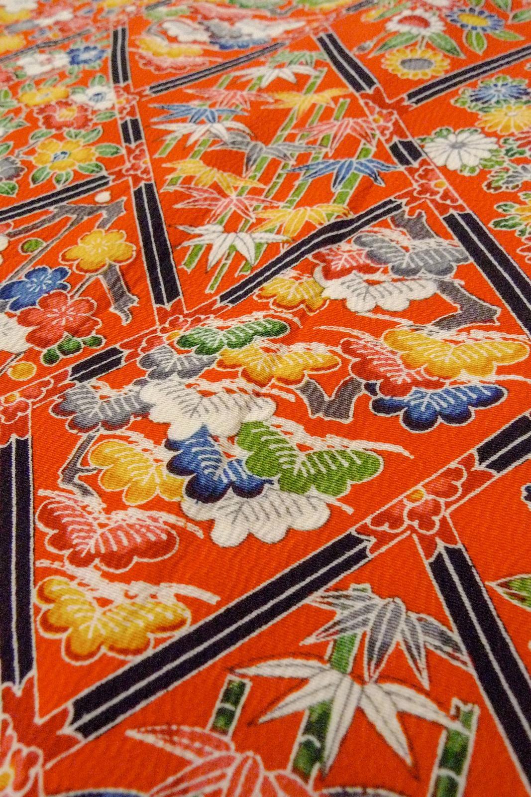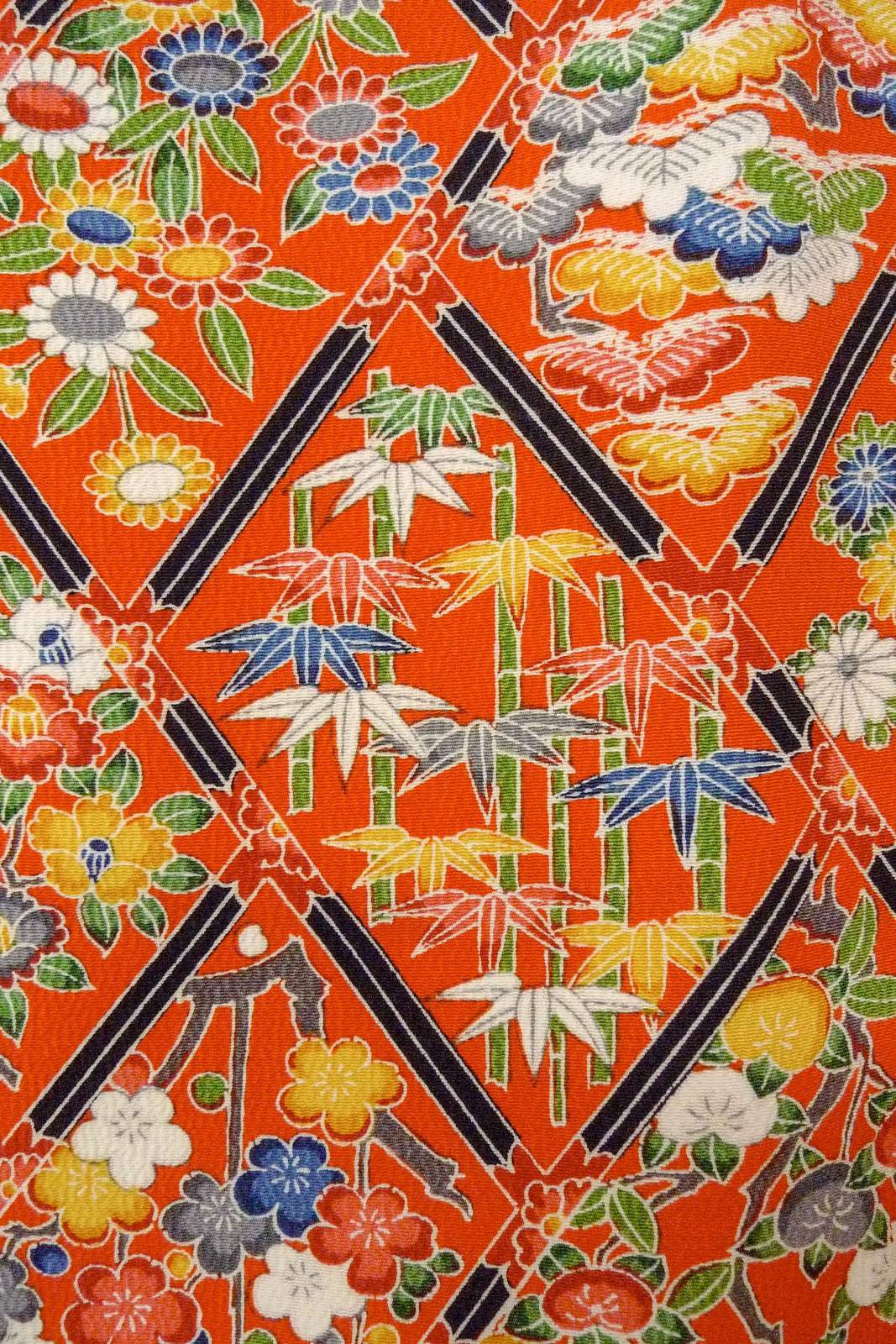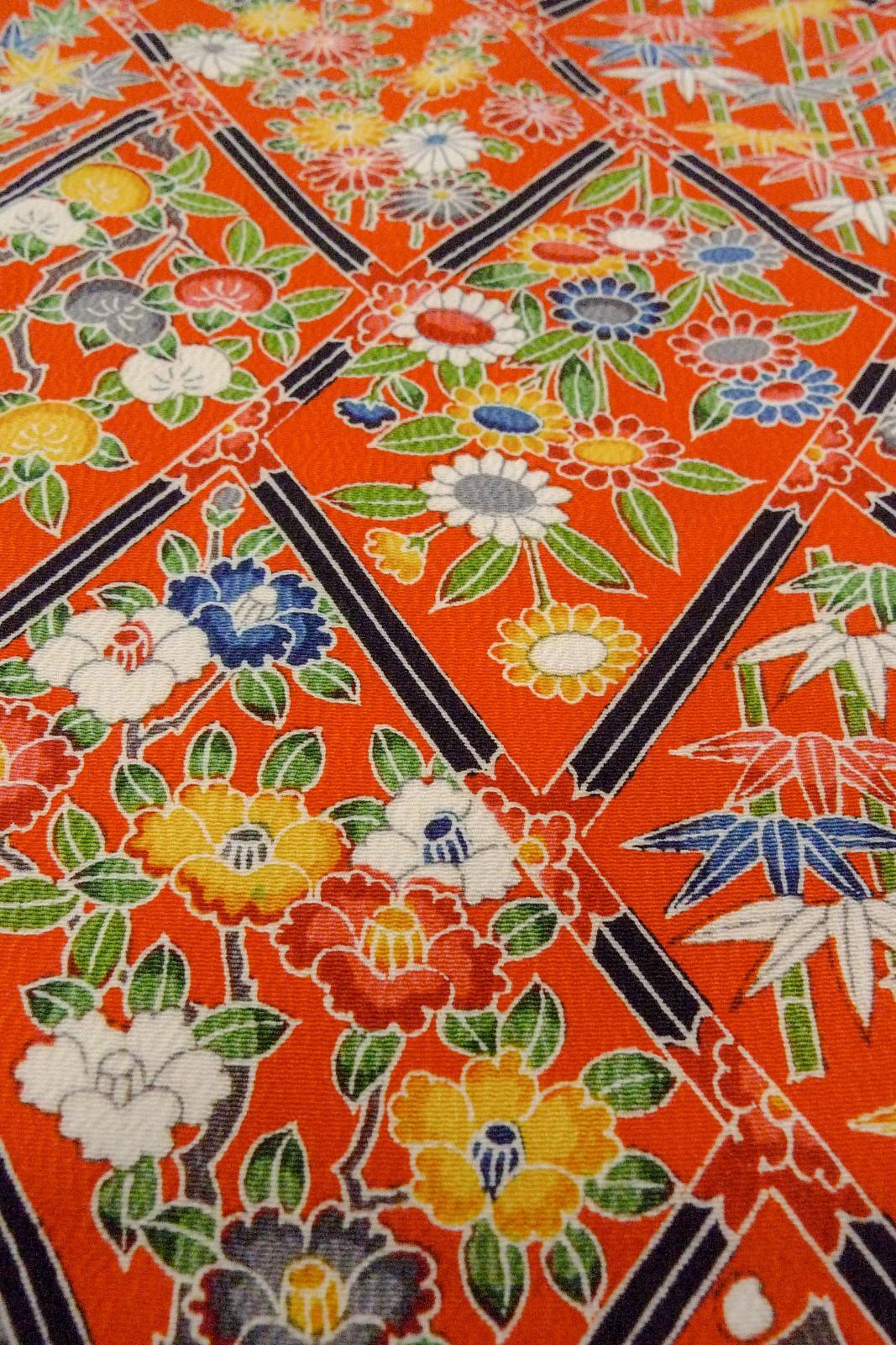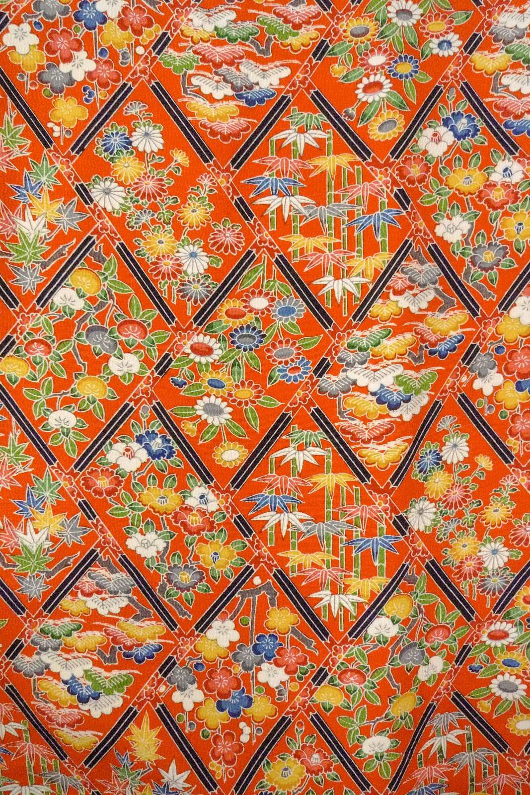 O0826V 女性用小紋 シルク(正絹) 鮮やか橙色, ぼたん 【中古】【USED】【リサイクル】 ★★★★☆【O0826V】 [O0826V]