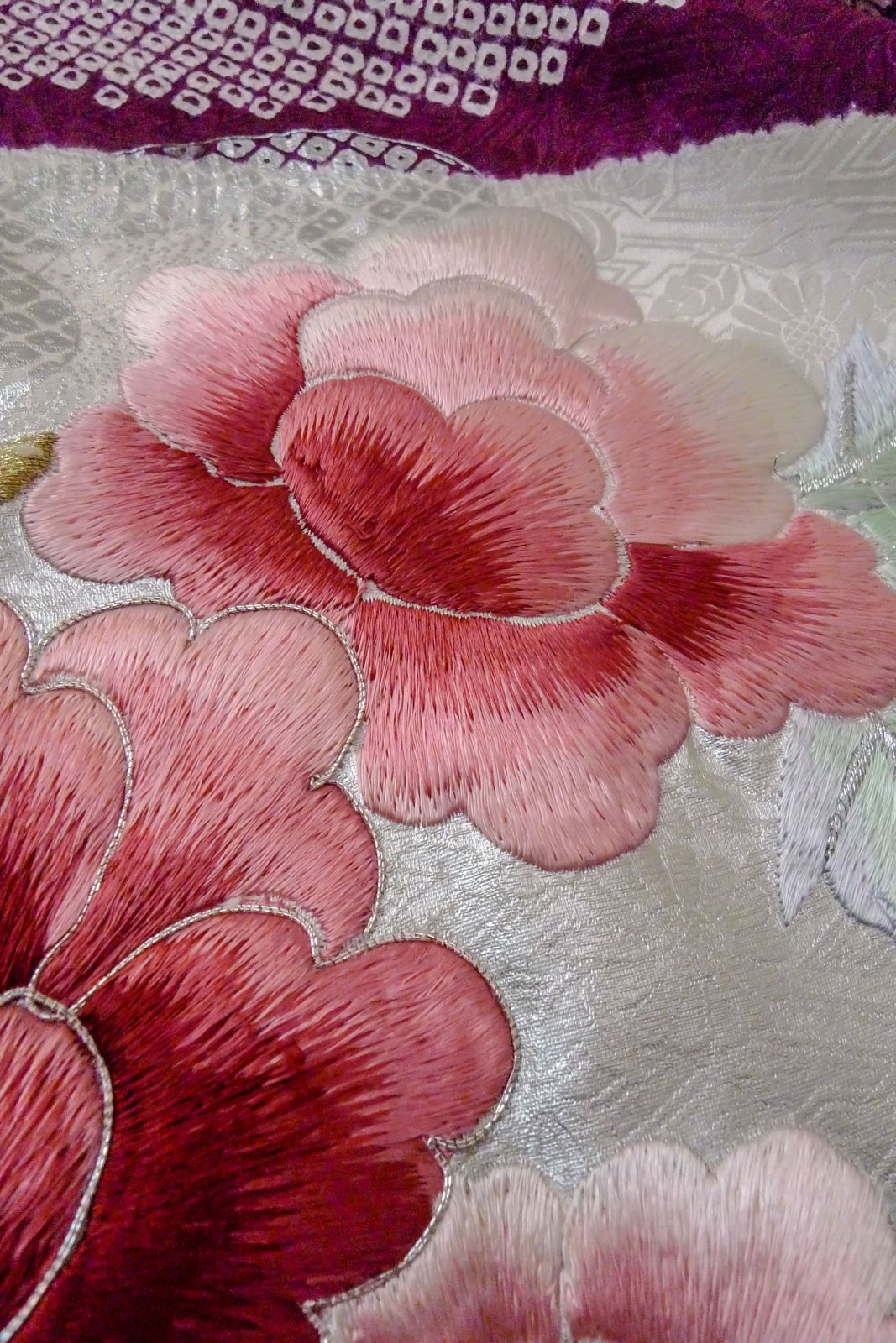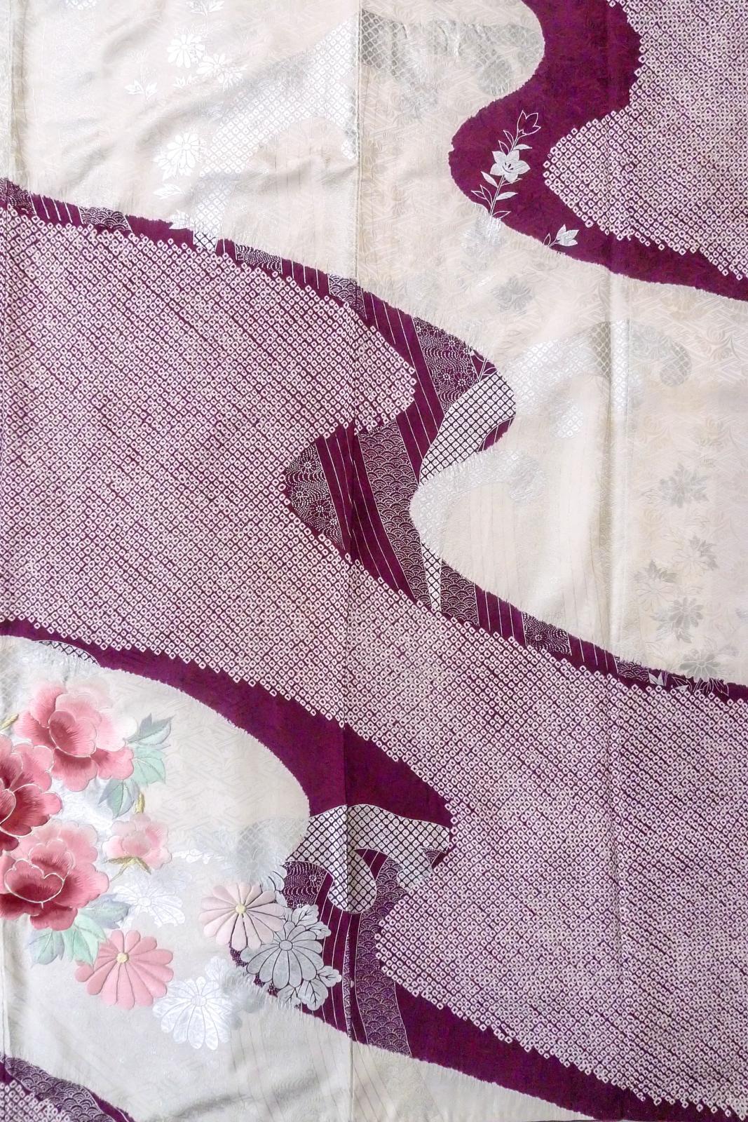 O1126A 女性用 振袖 シルク(正絹) 白, ぼたん 【中古】【USED】【リサイクル】 ★★★☆☆【O1126A】