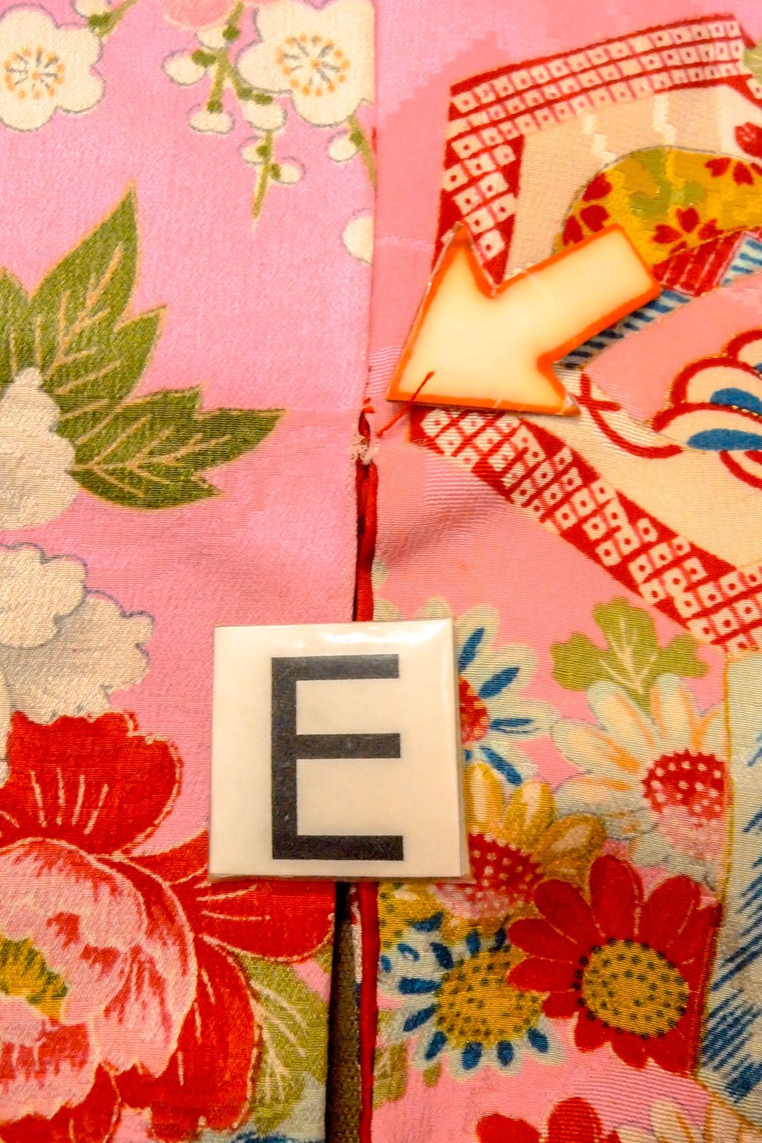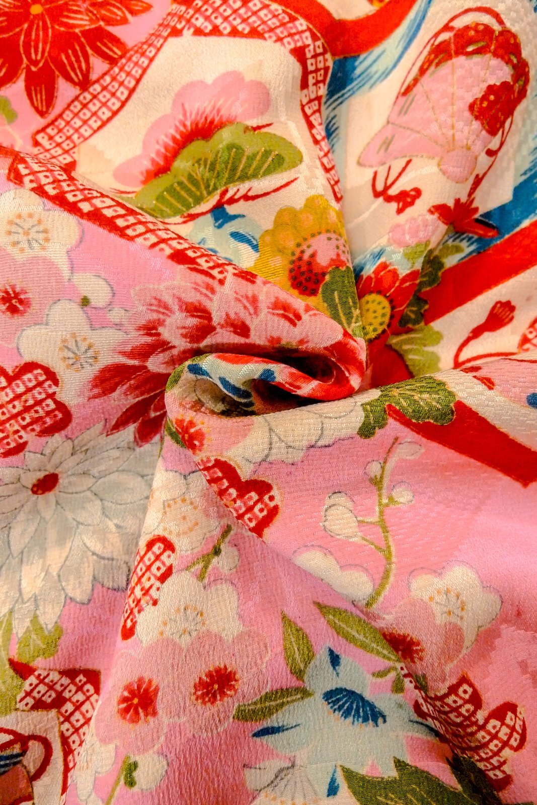 O1225B 女性用 女の子用着物 シルク(正絹) 光沢のある桃色, ぼたん 【中古】【USED】【リサイクル】 ★★☆☆☆【O1225B】