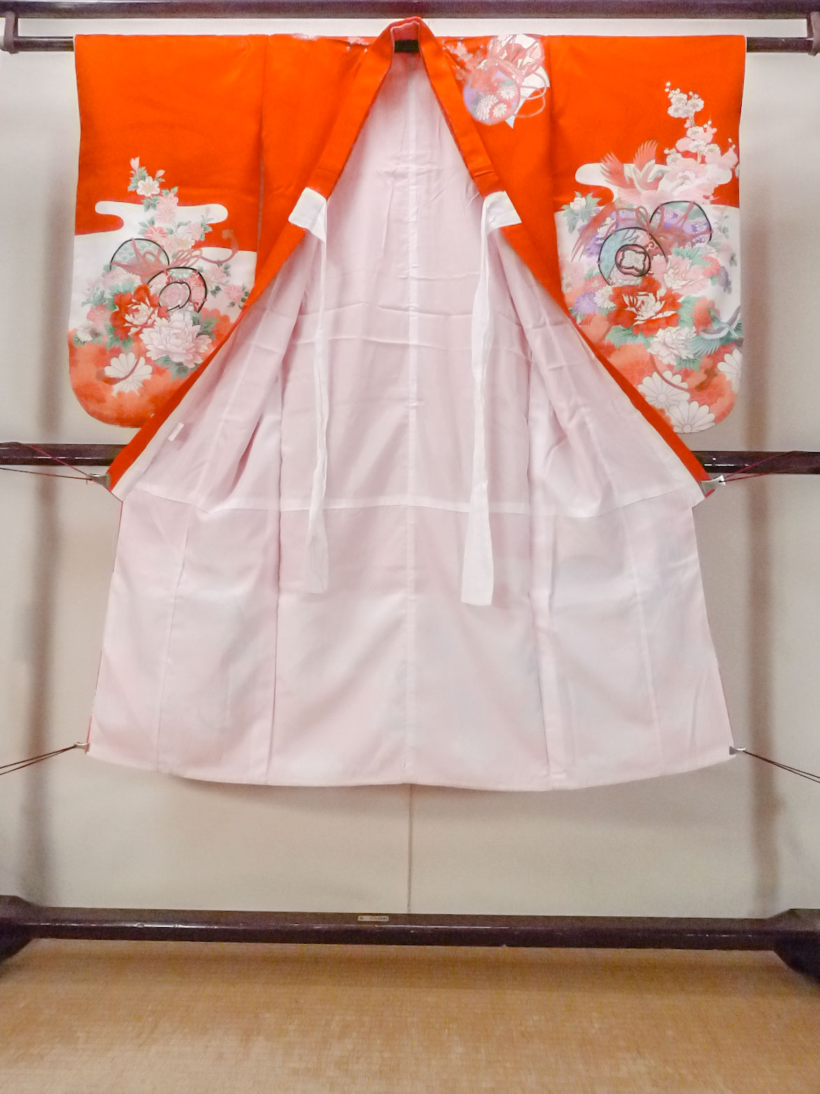 O1225O 女性用 女の子用着物 化繊 光沢のある鮮やか赤色, ぼたん 【中古】【USED】【リサイクル】 ★★☆☆☆【O1225O】 [O1225O]