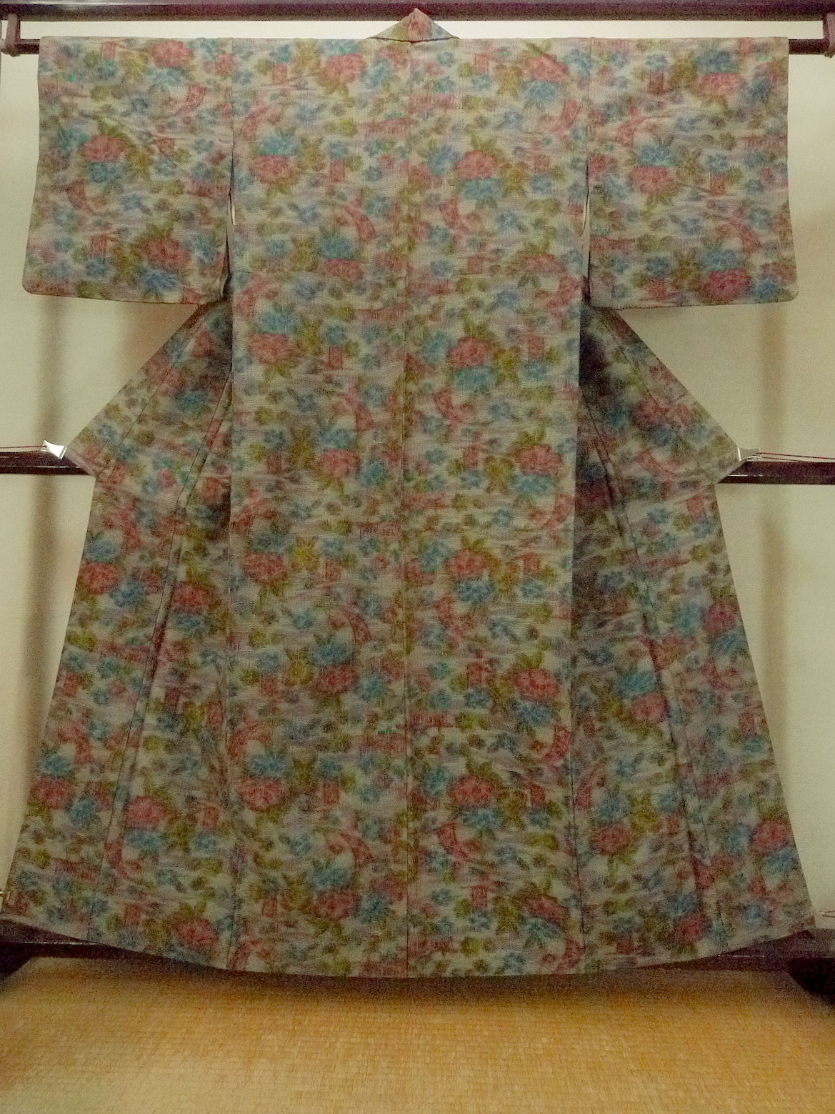 O1226D 女性用 紬 シルク(正絹) 淡い灰色がかったマルチカラー, 花 【中古】【USED】【リサイクル】 ★★★★☆【O1226D】