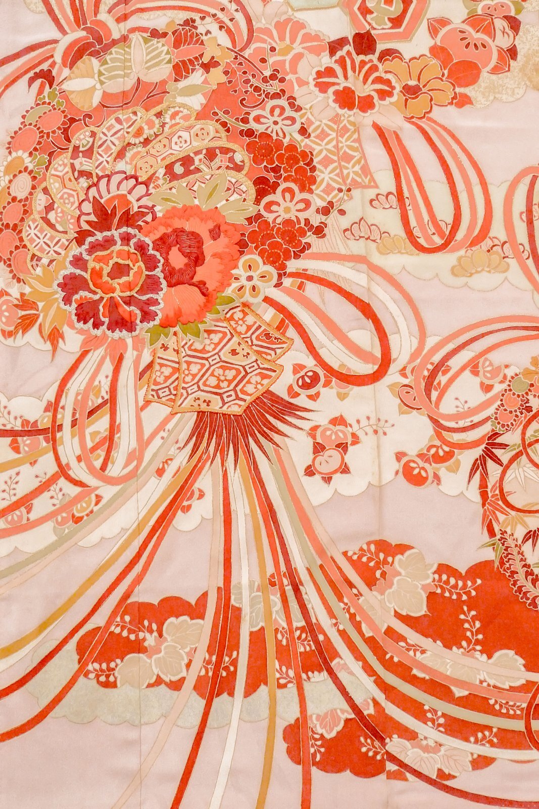 O1105A"女性用 振袖 シルク(正絹) 薄い桃色, ぼたん 【中古】【USED】【リサイクル】 ★★☆☆☆【O1105A】