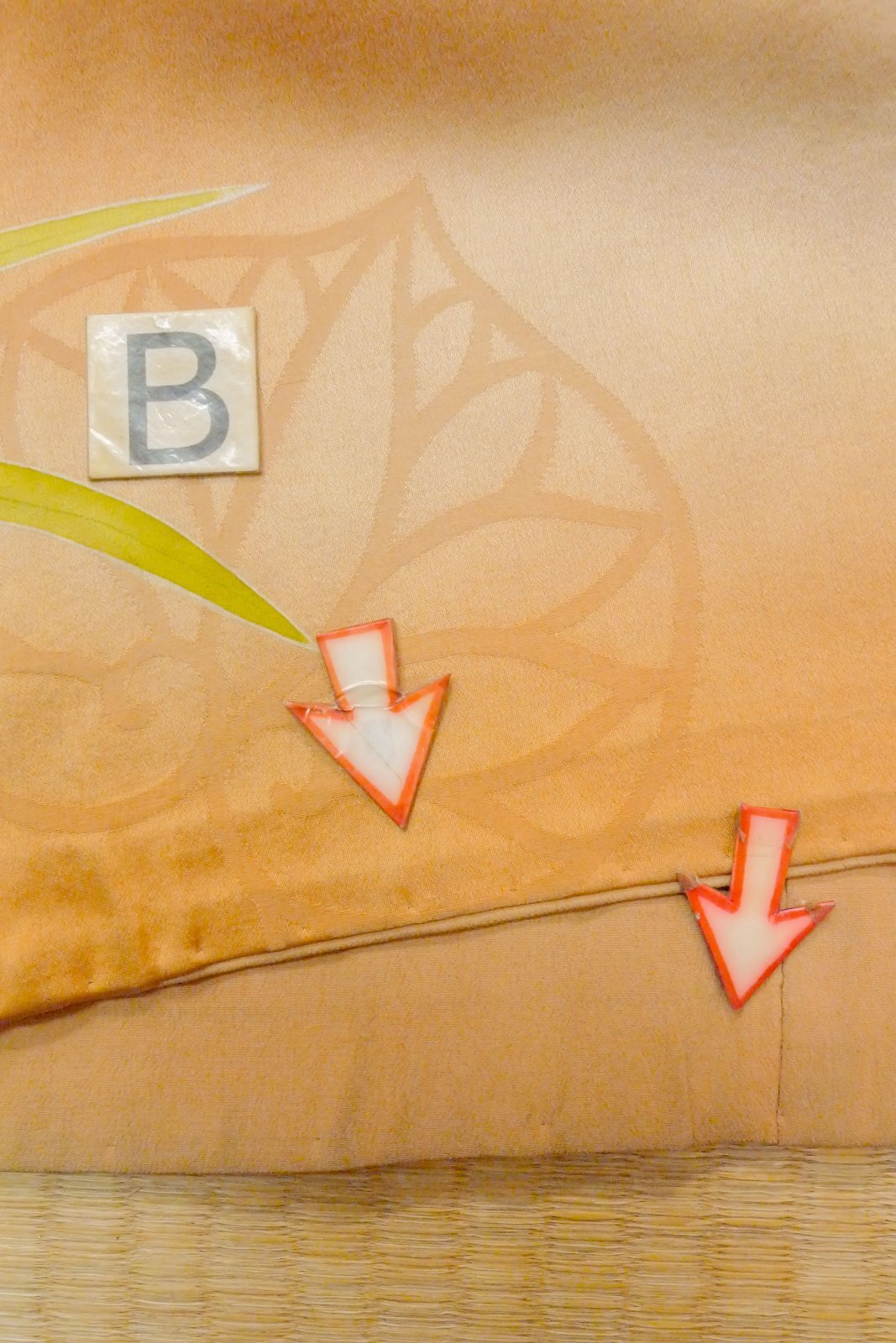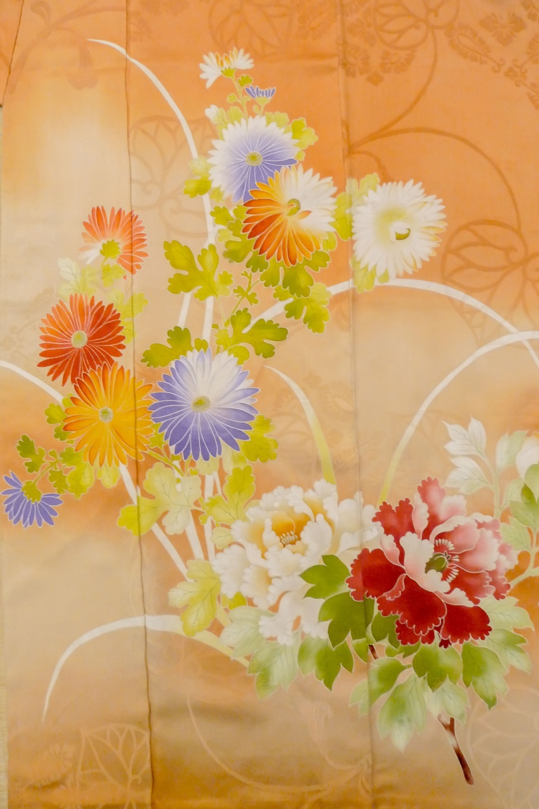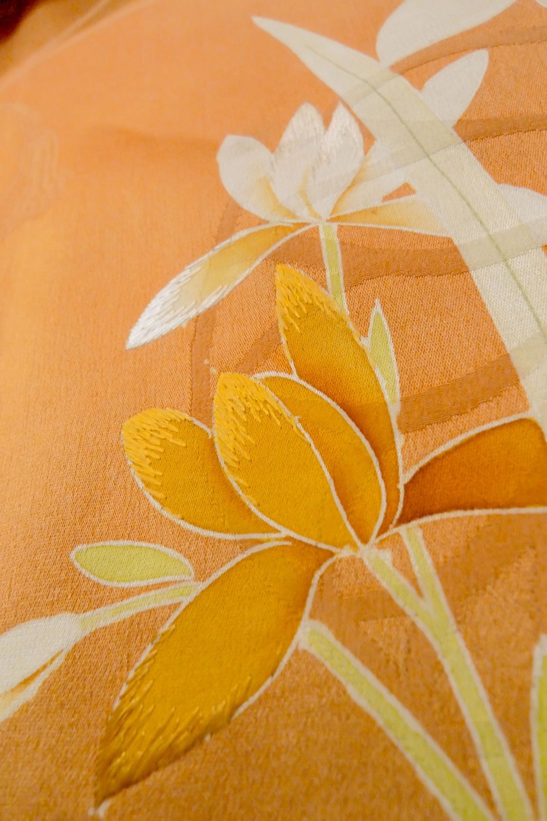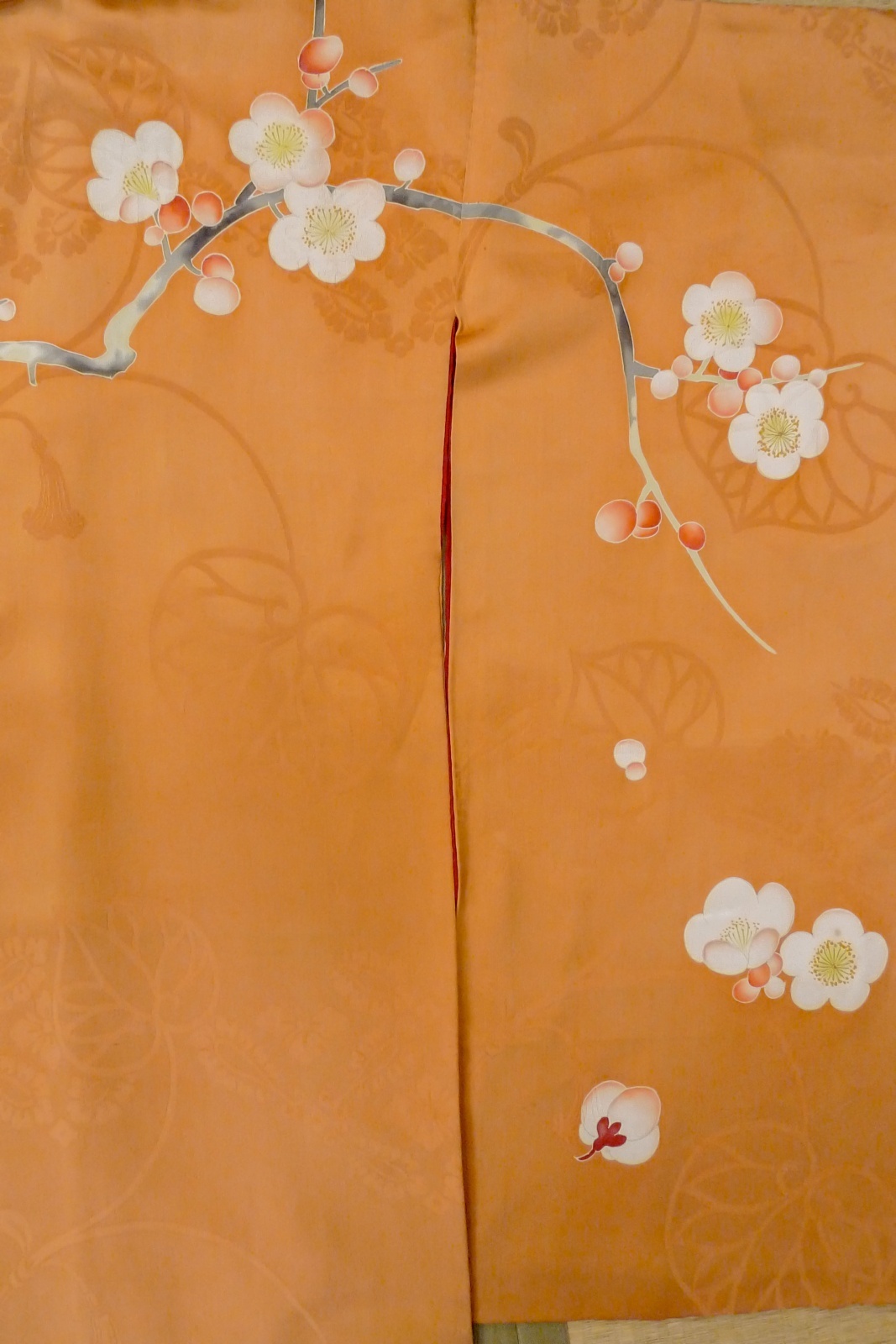 O1105B 女性用 振袖 シルク(正絹) 淡い橙色, ぼたん 【中古】【USED】【リサイクル】 ★★☆☆☆【O1105B】 [O1105B]