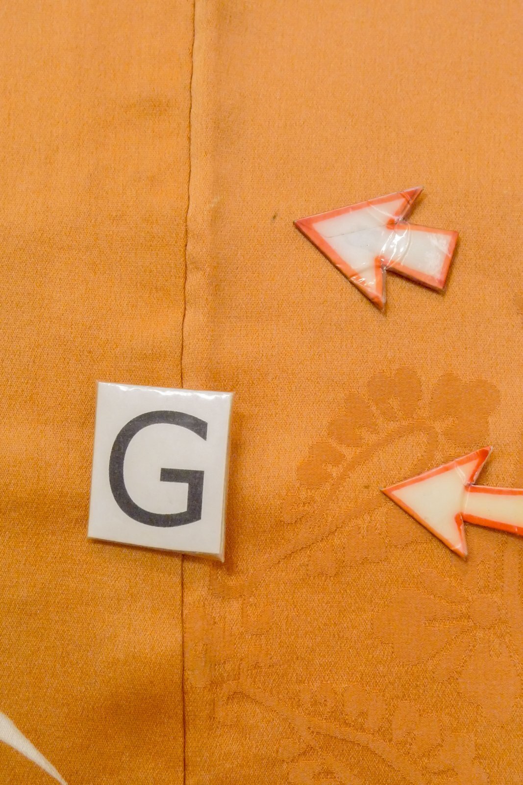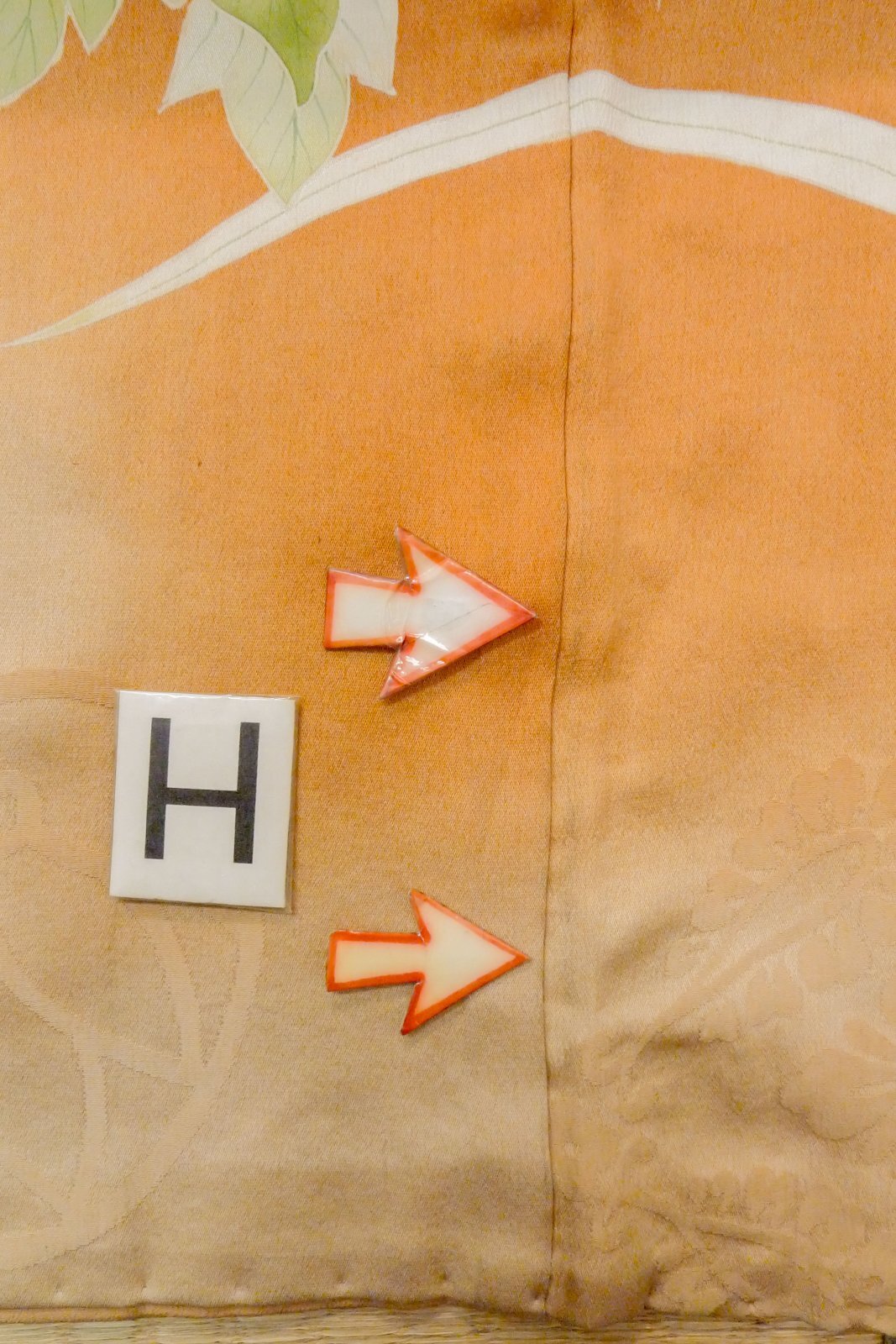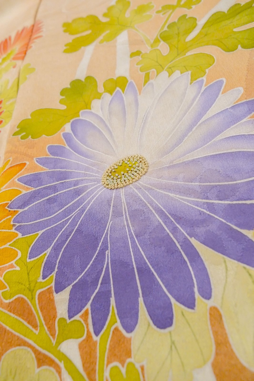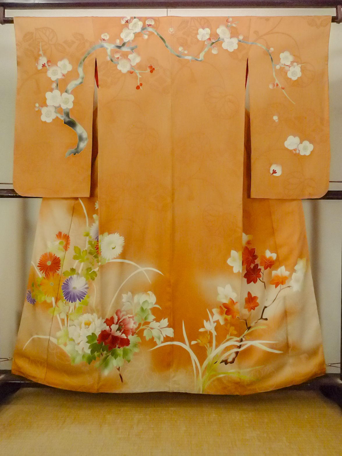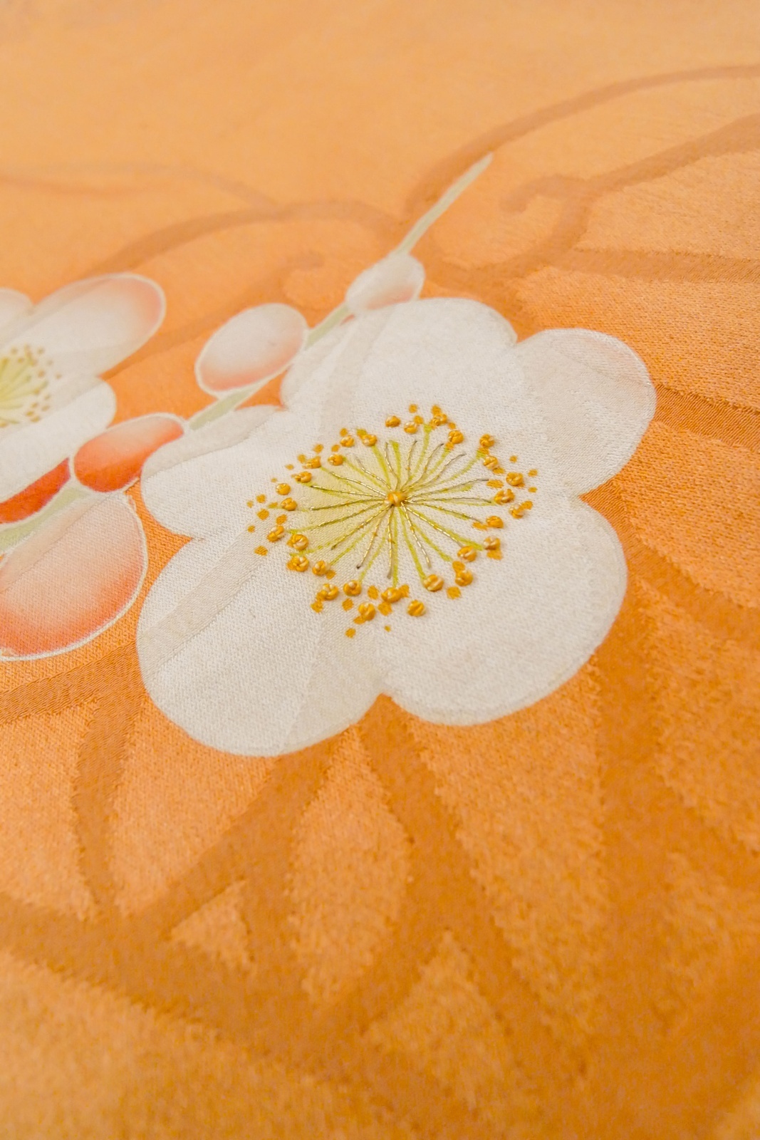 O1105B 女性用 振袖 シルク(正絹) 淡い橙色, ぼたん 【中古】【USED】【リサイクル】 ★★☆☆☆【O1105B】 [O1105B]