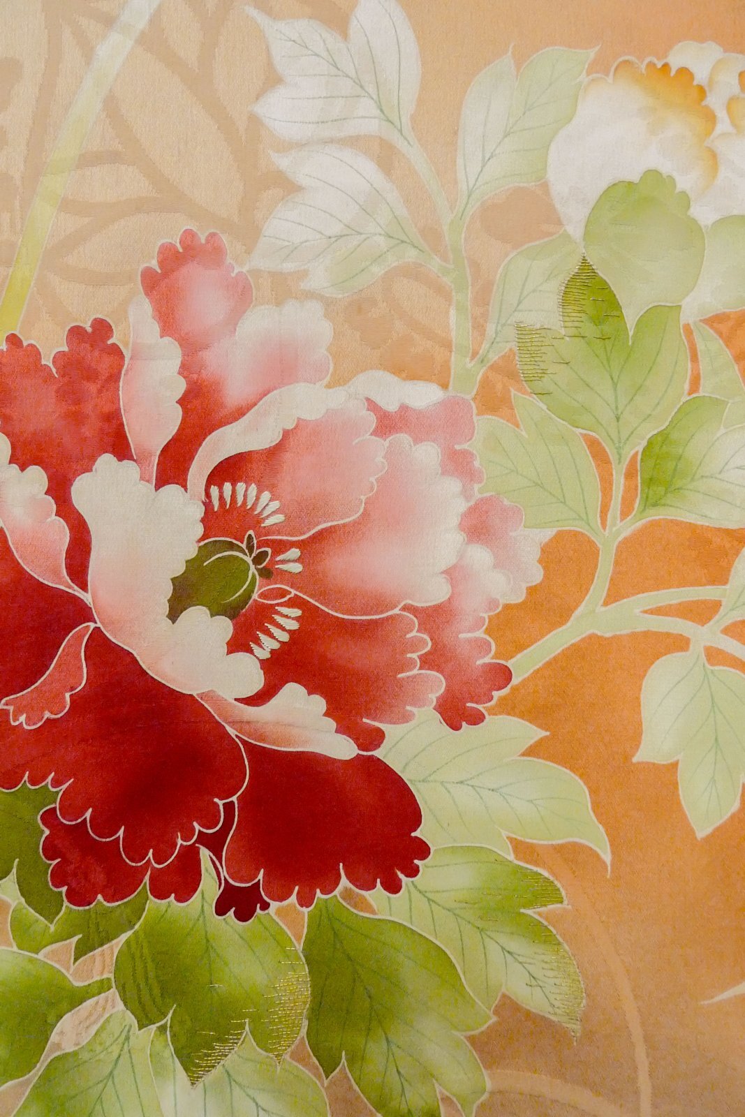 O1105B"女性用 振袖 シルク(正絹) 淡い橙色, ぼたん 【中古】【USED】【リサイクル】 ★★☆☆☆【O1105B】