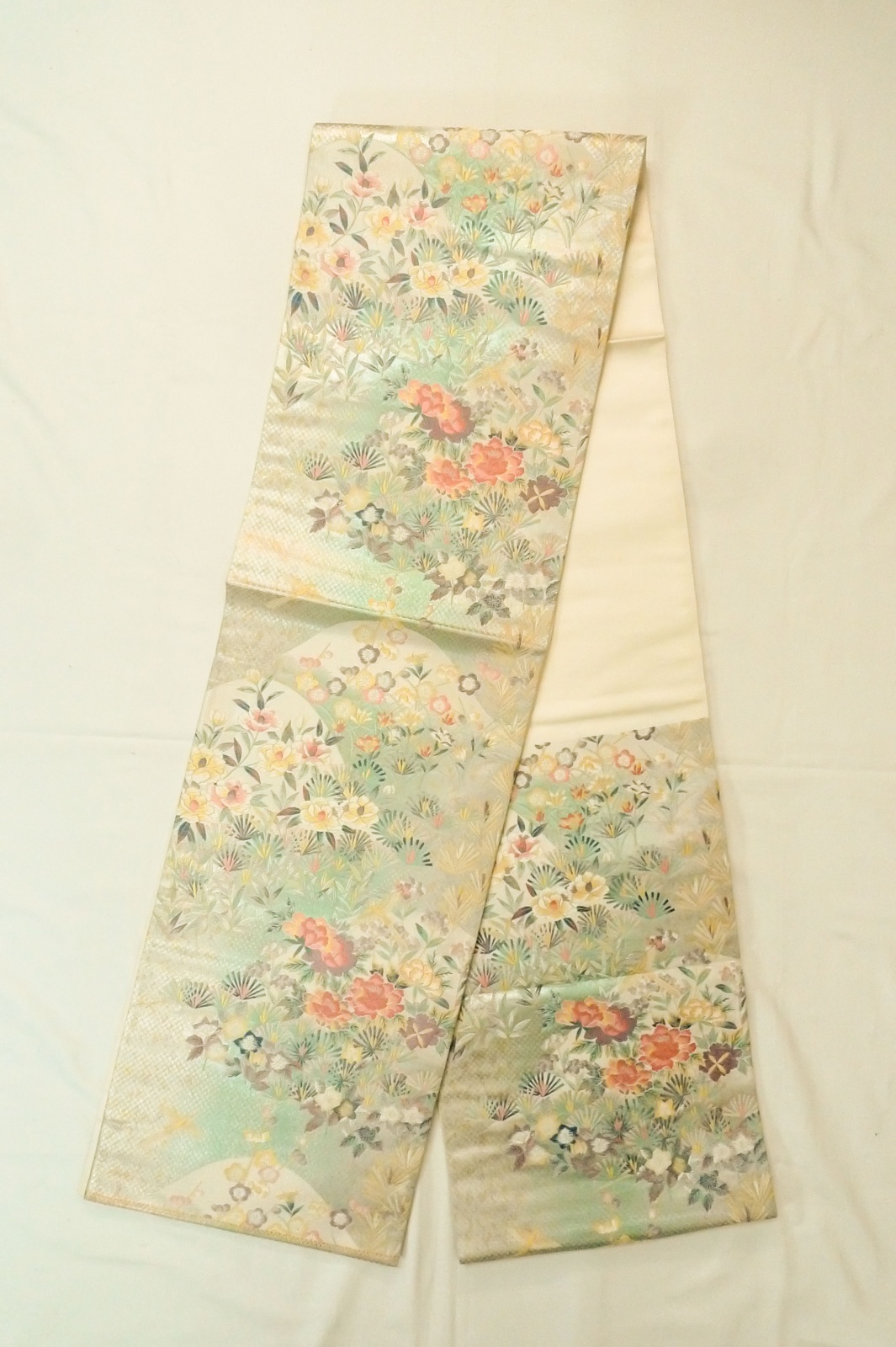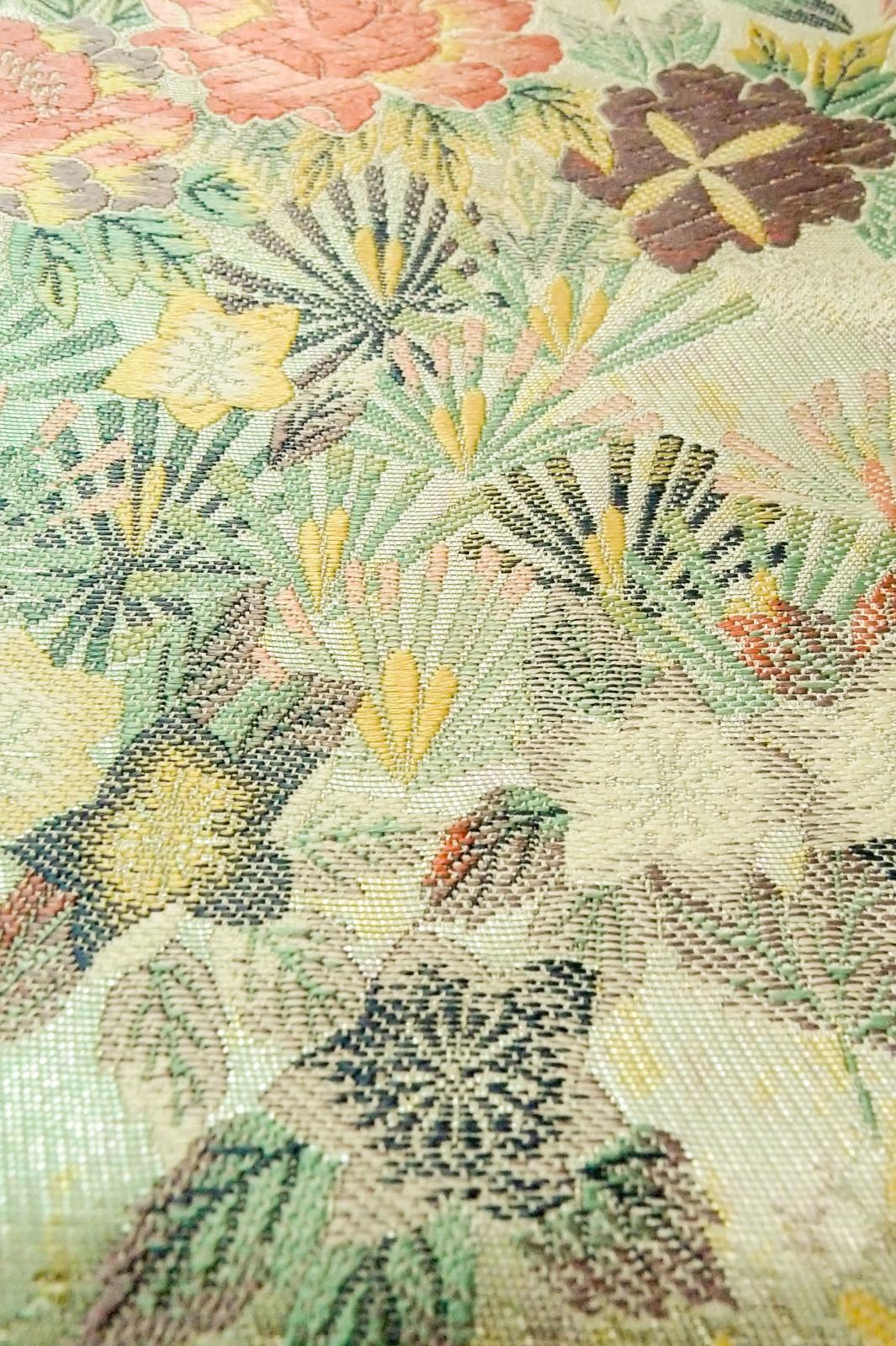 P0206K 袋帯 女性用着物 シルク(正絹) 光沢のある オフ ホワイト 花 【中古】 【USED】 【リサイクル】 ★★★★☆ [P0206K]