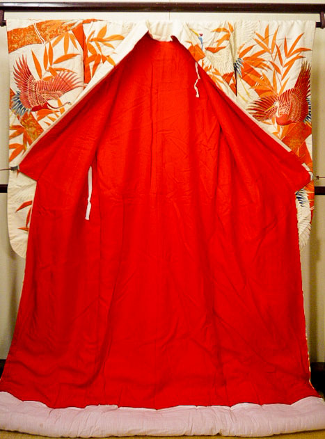 G0805Z 打掛 女性用着物 友禅、裾カバー シルク(正絹) 朱赤, 鶴 【中古】 【USED】 【リサイクル】 ★★★☆☆ [G0805Z]