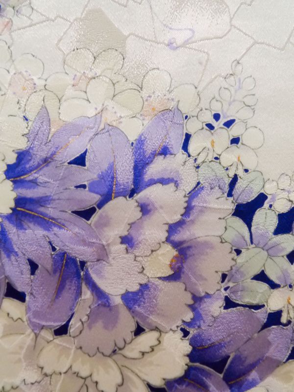 K1222D Mint 振袖 女性用着物 百合 シルク(正絹) オフ ホワイト, ぼたん 【中古】 【USED】 【リサイクル】 ★★★★☆ [K1222D]