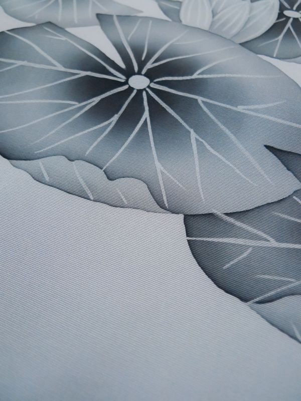 名古屋帯 蓮の葉 シルク(正絹) 淡い 青み 灰色, 葉 【中古】 【USED】 【リサイクル】 (Grade A+)